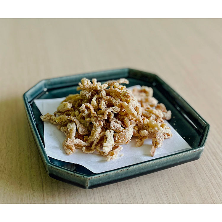 丁寧に下処理した国産の鶏皮をしっかり揚げて、うま味をギュッと閉じ込めました。オリジナルの衣でカリッとした食感に仕上げています。厳選した塩で味付けし、そのままおやつやおつまみとしてはもちろん、サラダやうどんのトッピングなどにもよく合います。食べだしたら止まらない商品です。